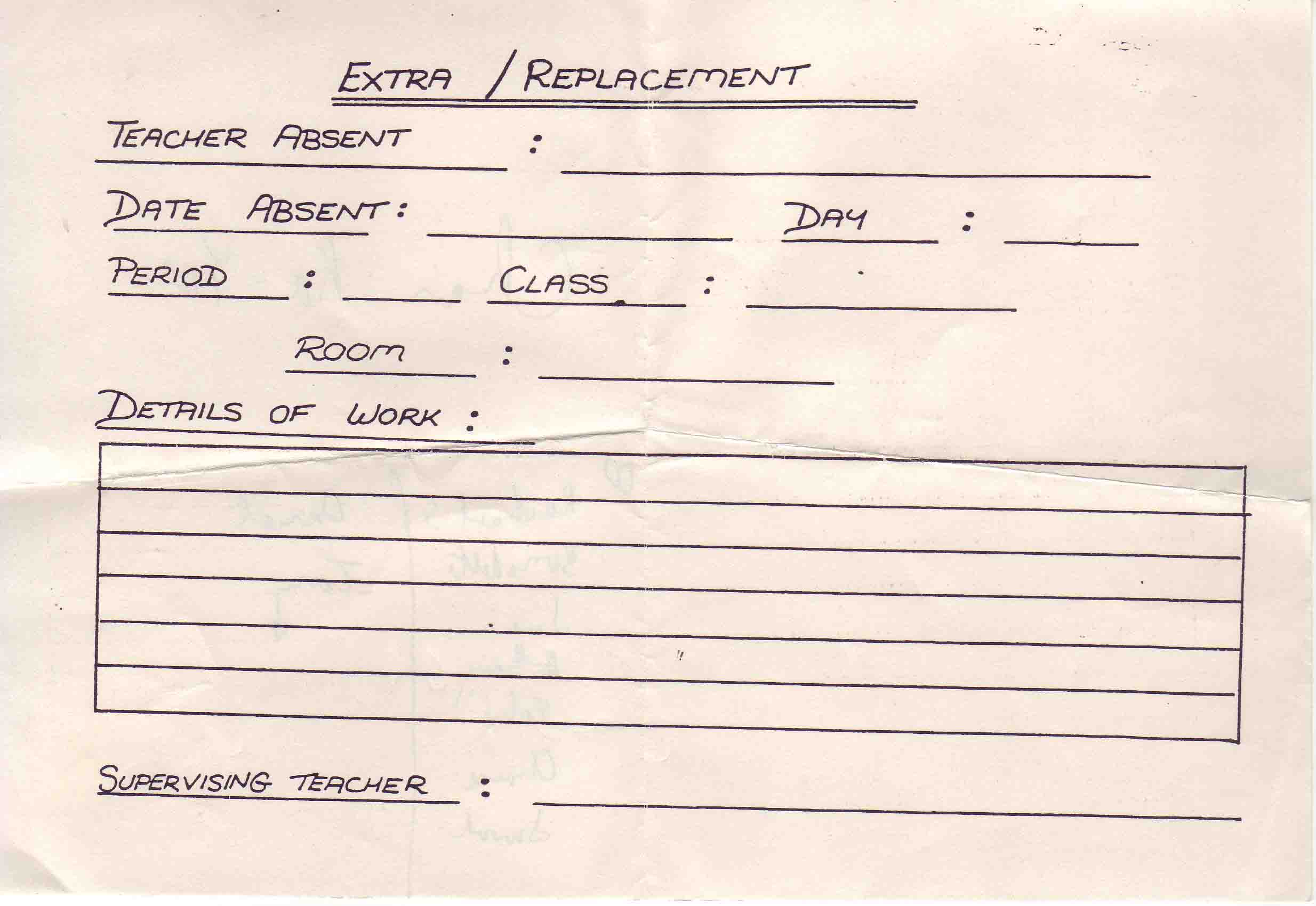 Usually Extra Notices have a section on them that allows the replacement teacher to make a comment on how the class performed and what stage of work the students reached. The advantage of electronic feedback (e-Feedback) is that teachers at home sick can view how their classes went via MyExtras on the internet. This information can be used by the absent teacher to help organise and generate further Extra Notices if required.